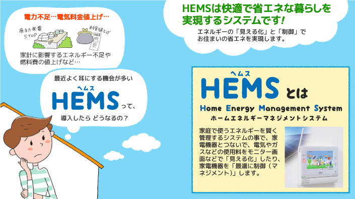 「HEMS」は住まいの家電機器、太陽光発電システム、給湯器などを自動的に制御(コントロール)し、消費エネルギー(電気・ガス・水道)を管理(マネジメント)できる省エネシステムです。
