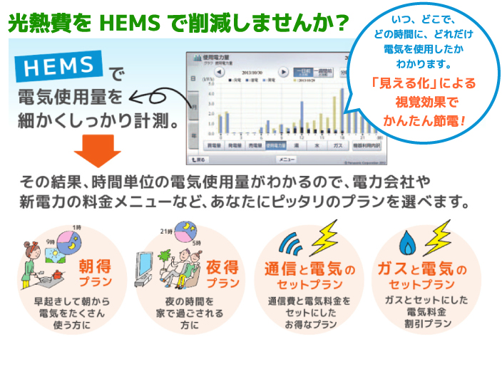 電力料金が安い時間帯に合わせたおトクな電気の使い方や、電力の受給状況に合わせた自動制御など、無理のない節電が可能になります。また消費エネルギーの状況はモニターでかんたんに確認できますので、住んでいる方の省エネ意識も高まり一石二鳥です。