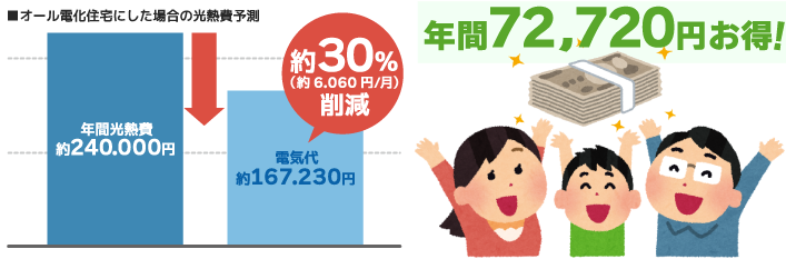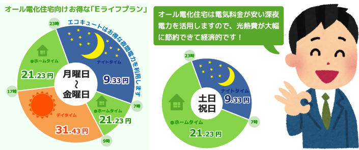 これまで別々だった電気とガスを「電気」一本にすることで、毎月かかっていた電気とガスの基本料金が電気だけとなりますので基本料金の節約に繋がります。また、オール電化住宅は特別な料金プラン(割安な夜間電力)を利用することが出来ますので、変更前よりも経済的なメリットを受けることができます。
