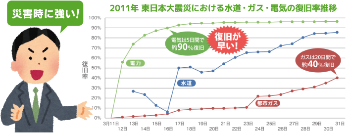されたライフライン(電気・ガス・水道)の復旧が早いのも特長です。電気の場合、約1週間程度で復旧します。