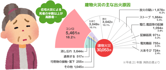 消防白書によると建物の出火原因として毎年「コンロ」が全体の20%前後を占めるというデータがあります。