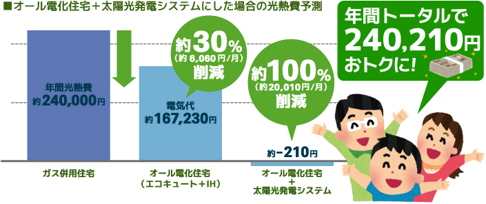 オール電化住宅に太陽光発電システムを導入することにより、昼間は太陽光発電システムで昼間の使用電力をまかない、使わず余った電力は売電して売電収入=光熱費削減。夜間はエコキュートが電気料金が割安な時間帯でお湯を作るのでさらに光熱費を抑えられます。
