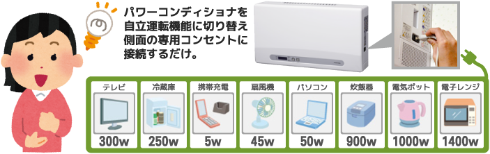 災害などで停電になってしまった時でも、太陽光発電システムで発電できる状態であれば、自立運転に切り替えることで最大1500W(AC100V)までの電気を賄うことが出来ます。ご家庭内にある電気機器すべてを長時間使えるわけではありませんが、万一の際に最低限の電気が使えるのは心強く大変助かります。